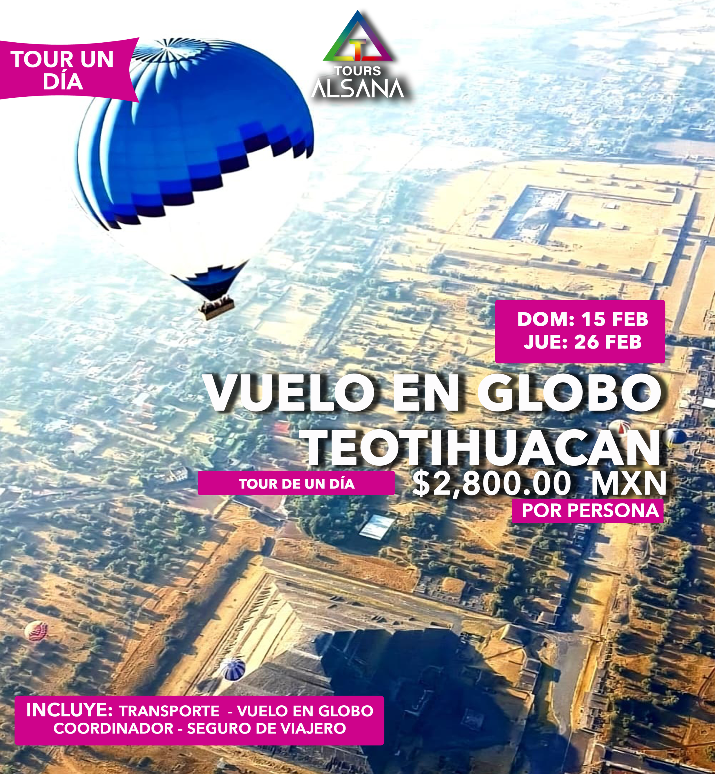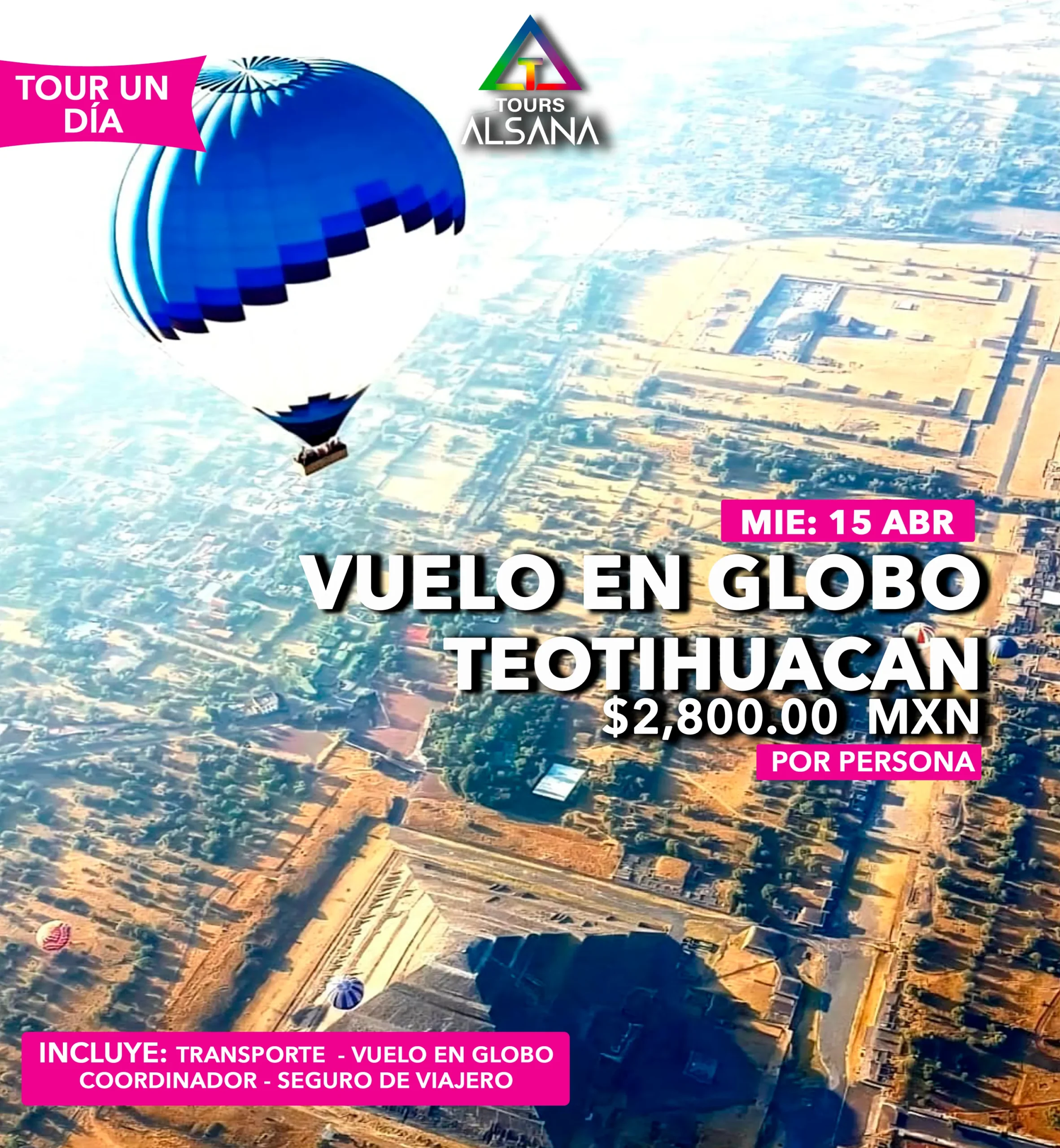 | Transporte redondo en autobús o camioneta de turismo. Vuelo en globo compartido en Teotihuacán de 45 min. – Coffe Break – Brindis con vino blanco espumoso – Certificado de Vuelo Personalizado – Desayuno | Visita libre a Zona Arqueológica de Teotihuacán |